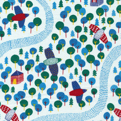 New from Steffie Brocoli, In the Forest tells a folkloric tale of an adventure in a fantastical forest. Over the Forest is a whimsical print of a sweet little forest scene: colorfully feathered birds soar over tiny logs cabins nestled among winding streams and varying trees, all in shades of blues, leaf green, bright red, and yellow.