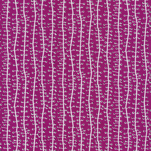 Micromod from the Green Bee Design and Pattern team artist Rob Bancroft is a cool set of retro-inspired geometrics on an intimate scale. Seaweed in Purple is a white and black winding seaweed pattern on a plum purple background.