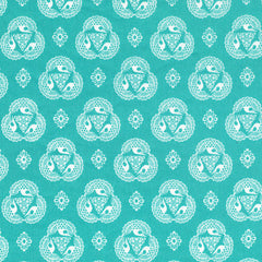 Tsuru means Crane in Japanese, where designer Rashida Coleman-Hale spent part of her youth. Tsuru soars with beauty and grace and a touch modern funkiness. Old Lace in Vermillion is a new take on a classic lace pattern, with graceful ivory cranes forming a beautiful, vintage repeating lace design on a brilliant cerulean background.