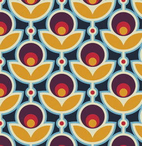 fashionable, European-inspired line that blend a variety of patterns and stunning floral motifs. Primrose in Midnight is a bold, mod floral pattern with marigold, light blue, dark purple, poppy red, and natural with a midnight blue background in a durable home decorating weight.