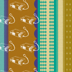 Camera in Ring a Ling is another amazing vintage inspired print from Melody Miller for Kokka. In this large repeat print, metallic silver cameras and mid-century stars adorn scalloped and geometric panels of aqua, teal, dark purple, chartreuse, and brown.