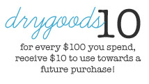 It's with excitement that the Drygoods10 rewards program launches! If you're a newsletter subscriber then you're eligible for Drygoods10. For every $100 you spend, you'll receive $10 towards a future purchase. If you spend $500 within a calendar year, you'll get a bonus $25 credit (that's $75 versus $50 in fabric back)!